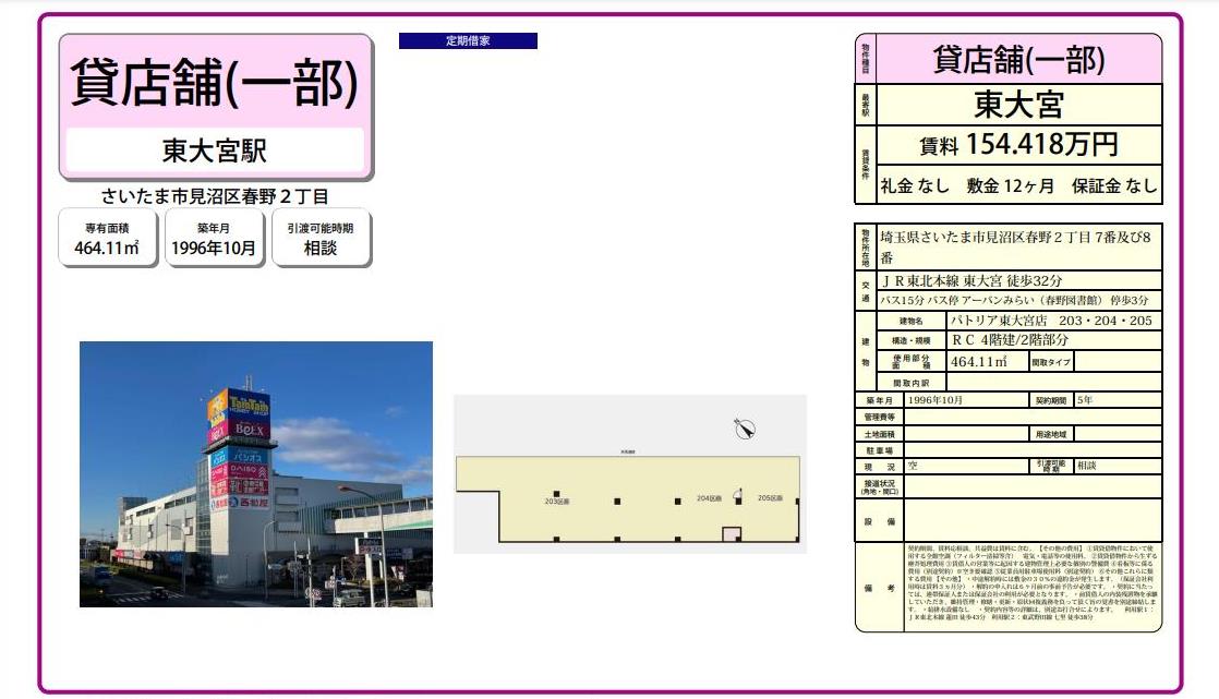 埼玉県さいたま市見沼区春野2-7番及び8番 (大宮) パトリア東大宮店 詳細データ