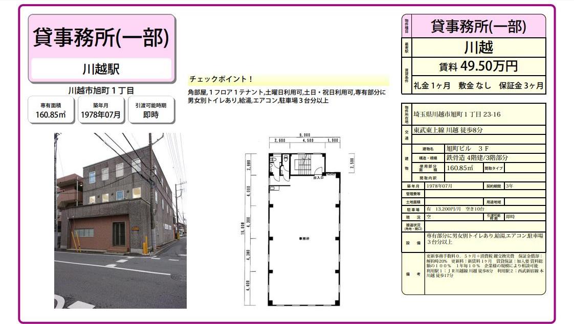 埼玉県川越市旭町1-23-16の賃貸事務所(貸事務所)・貸店舗をお探しのお客様へご案内-このたびは首都圏最大級、貸事務所・貸店舗専門ポータルサイトの埼玉オフィスMOVEをご利用いただき誠に有り難うございます。事務所移転、飲食店開業や新規独立まで賃貸事務所・賃貸オフィス・貸店舗の仲介実績豊富なスタッフがフルサポート致します。埼玉県川越市旭町1-23-16の大型駐車場付貸事務所、重飲食、美容院や居抜き店舗、レンタルオフィスまで貸事務所(賃貸事務所)、貸店舗を簡単に検索できます!埼玉県川越市旭町1-23-16でSOHO、賃貸オフィス、一棟ビルの貸事務所の貸主・オーナー様には無料にて広告掲載いたしますので是非、お問い合わせください。その他、埼玉県川越市旭町1-23-16で貸事務所・貸店舗をお探しのテナント様にはフリーレント、引越しサービスやオフィスレイアウトもアドバイス出来ますのでご相談ください。 |