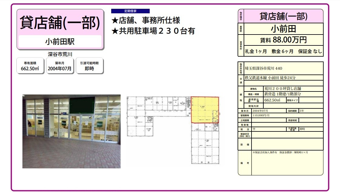 埼玉県深谷市荒川440 (小前田) 荒川200坪貸し店舗 詳細データ