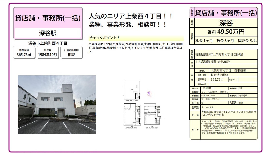 埼玉県深谷市上柴町西4-2番地3の賃貸事務所(貸事務所)・貸店舗をお探しのお客様へご案内-このたびは首都圏最大級、貸事務所・貸店舗専門ポータルサイトの埼玉オフィスMOVEをご利用いただき誠に有り難うございます。事務所移転、飲食店開業や新規独立まで賃貸事務所・賃貸オフィス・貸店舗の仲介実績豊富なスタッフがフルサポート致します。埼玉県深谷市上柴町西4-2番地3の大型駐車場付貸事務所、重飲食、美容院や居抜き店舗、レンタルオフィスまで貸事務所(賃貸事務所)、貸店舗を簡単に検索できます!埼玉県深谷市上柴町西4-2番地3でSOHO、賃貸オフィス、一棟ビルの貸事務所の貸主・オーナー様には無料にて広告掲載いたしますので是非、お問い合わせください。その他、埼玉県深谷市上柴町西4-2番地3で貸事務所・貸店舗をお探しのテナント様にはフリーレント、引越しサービスやオフィスレイアウトもアドバイス出来ますのでご相談ください。 |