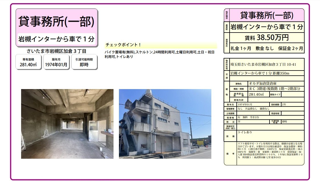 埼玉県さいたま市岩槻区加倉3-10-41の賃貸事務所(貸事務所)・貸店舗をお探しのお客様へご案内-このたびは首都圏最大級、貸事務所・貸店舗専門ポータルサイトの埼玉オフィスMOVEをご利用いただき誠に有り難うございます。事務所移転、飲食店開業や新規独立まで賃貸事務所・賃貸オフィス・貸店舗の仲介実績豊富なスタッフがフルサポート致します。埼玉県さいたま市岩槻区加倉3-10-41の大型駐車場付貸事務所、重飲食、美容院や居抜き店舗、レンタルオフィスまで貸事務所(賃貸事務所)、貸店舗を簡単に検索できます!埼玉県さいたま市岩槻区加倉3-10-41でSOHO、賃貸オフィス、一棟ビルの貸事務所の貸主・オーナー様には無料にて広告掲載いたしますので是非、お問い合わせください。その他、埼玉県さいたま市岩槻区加倉3-10-41で貸事務所・貸店舗をお探しのテナント様にはフリーレント、引越しサービスやオフィスレイアウトもアドバイス出来ますのでご相談ください。 |