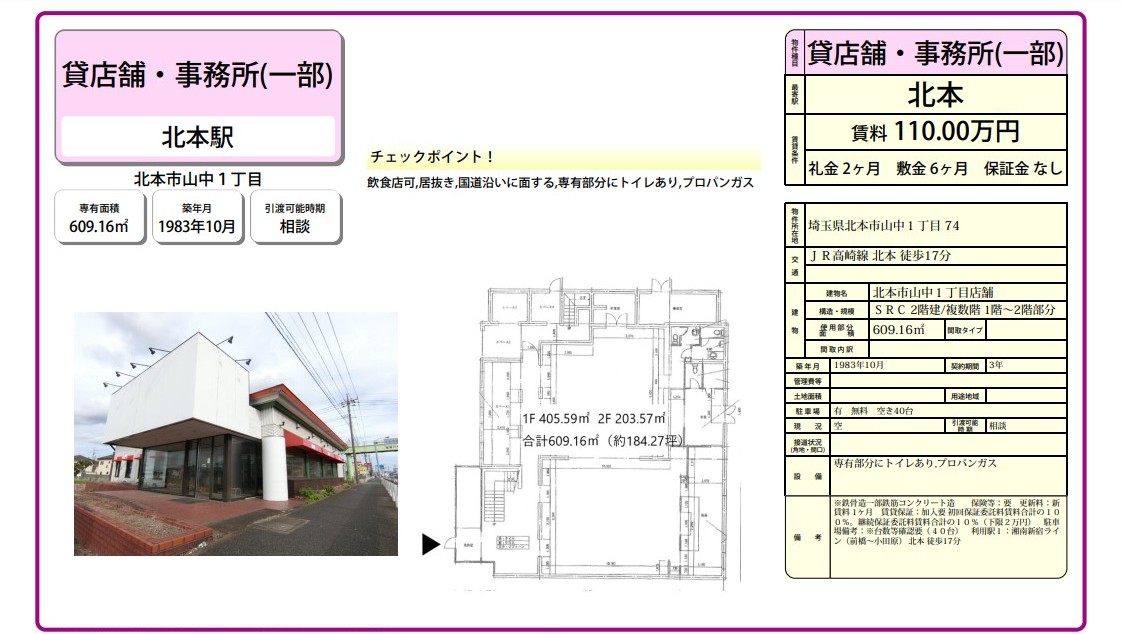 埼玉県北本市山中1-74 (北本) 北本市山中1丁目店舗 詳細データ