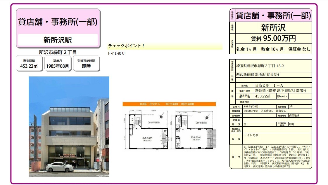 埼玉県所沢市緑町2-13-2の賃貸事務所(貸事務所)・貸店舗をお探しのお客様へご案内-このたびは首都圏最大級、貸事務所・貸店舗専門ポータルサイトの埼玉オフィスMOVEをご利用いただき誠に有り難うございます。事務所移転、飲食店開業や新規独立まで賃貸事務所・賃貸オフィス・貸店舗の仲介実績豊富なスタッフがフルサポート致します。埼玉県所沢市緑町2-13-2の大型駐車場付貸事務所、重飲食、美容院や居抜き店舗、レンタルオフィスまで貸事務所(賃貸事務所)、貸店舗を簡単に検索できます!埼玉県所沢市緑町2-13-2でSOHO、賃貸オフィス、一棟ビルの貸事務所の貸主・オーナー様には無料にて広告掲載いたしますので是非、お問い合わせください。その他、埼玉県所沢市緑町2-13-2で貸事務所・貸店舗をお探しのテナント様にはフリーレント、引越しサービスやオフィスレイアウトもアドバイス出来ますのでご相談ください。 |
