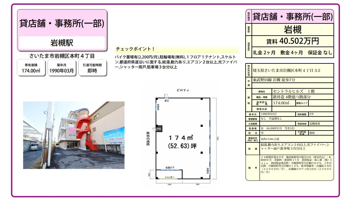 埼玉県さいたま市岩槻区本町4-3-2の賃貸事務所(貸事務所)・貸店舗をお探しのお客様へご案内-このたびは首都圏最大級、貸事務所・貸店舗専門ポータルサイトの埼玉オフィスMOVEをご利用いただき誠に有り難うございます。事務所移転、飲食店開業や新規独立まで賃貸事務所・賃貸オフィス・貸店舗の仲介実績豊富なスタッフがフルサポート致します。埼玉県さいたま市岩槻区本町4-3-2の大型駐車場付貸事務所、重飲食、美容院や居抜き店舗、レンタルオフィスまで貸事務所(賃貸事務所)、貸店舗を簡単に検索できます!埼玉県さいたま市岩槻区本町4-3-2でSOHO、賃貸オフィス、一棟ビルの貸事務所の貸主・オーナー様には無料にて広告掲載いたしますので是非、お問い合わせください。その他、埼玉県さいたま市岩槻区本町4-3-2で貸事務所・貸店舗をお探しのテナント様にはフリーレント、引越しサービスやオフィスレイアウトもアドバイス出来ますのでご相談ください。