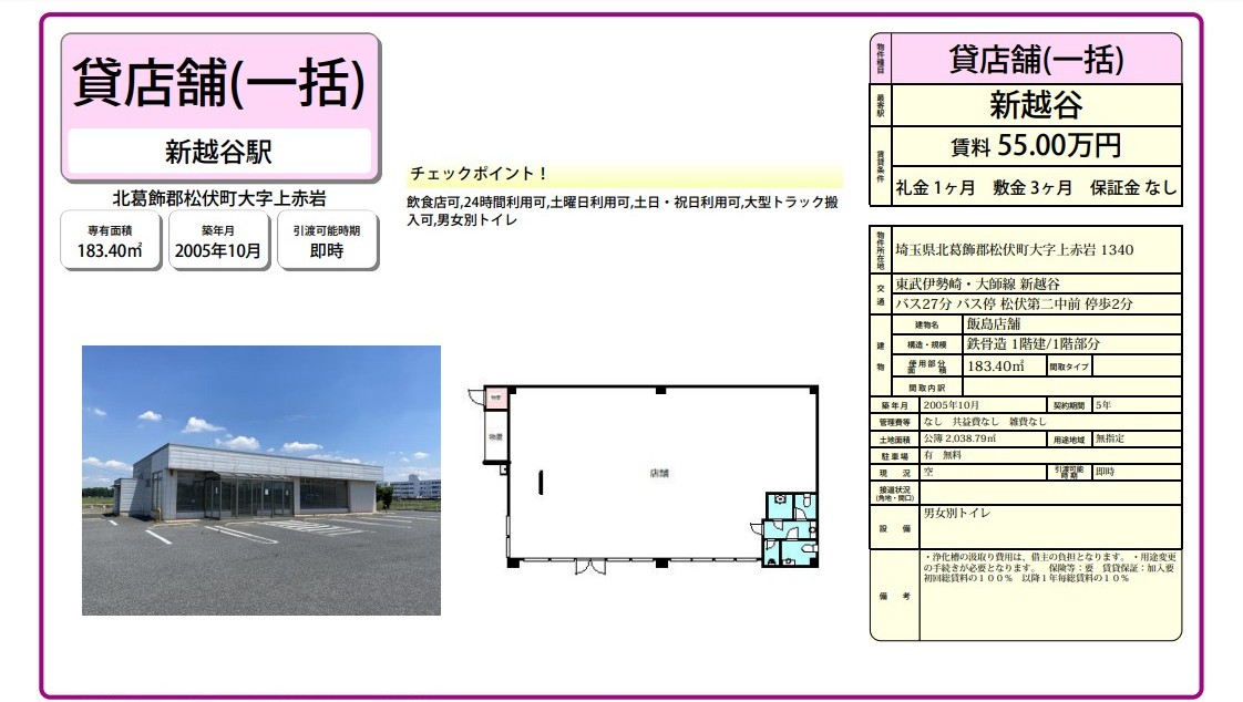 埼玉県北葛飾郡松伏町大字上赤岩1340 (新越谷) 飯島店舗 詳細データ