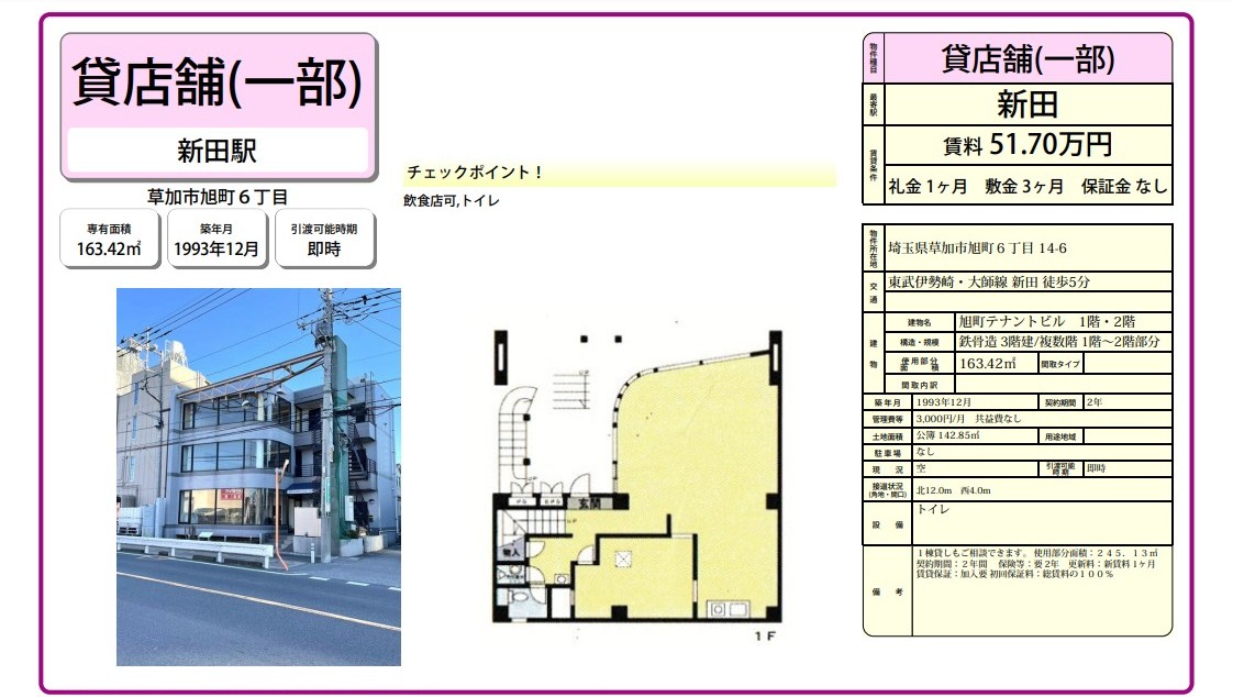 | 備考 | 飲食店可 条件交渉ご相談ください。 |