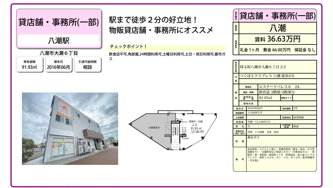 埼玉県 八潮市大瀬6-2-2の賃貸事務所(貸事務所)・貸店舗をお探しのお客様へご案内-このたびは首都圏最大級、貸事務所・貸店舗専門ポータルサイトの埼玉オフィスMOVEをご利用いただき誠に有り難うございます。事務所移転、飲食店開業や新規独立まで賃貸事務所・賃貸オフィス・貸店舗の仲介実績豊富なスタッフがフルサポート致します。埼玉県八潮市大瀬6-2-2の大型駐車場付貸事務所、重飲食、美容院や居抜き店舗、レンタルオフィスまで貸事務所(賃貸事務所)、貸店舗を簡単に検索できます!埼玉県八潮市大瀬6-2-2でSOHO、賃貸オフィス、一棟ビルの貸事務所の貸主・オーナー様には無料にて広告掲載いたしますので是非、お問い合わせください。その他、埼玉県八潮市大瀬6-2-2で貸事務所・貸店舗をお探しのテナント様にはフリーレント、引越しサービスやオフィスレイアウトもアドバイス出来ますのでご相談ください。