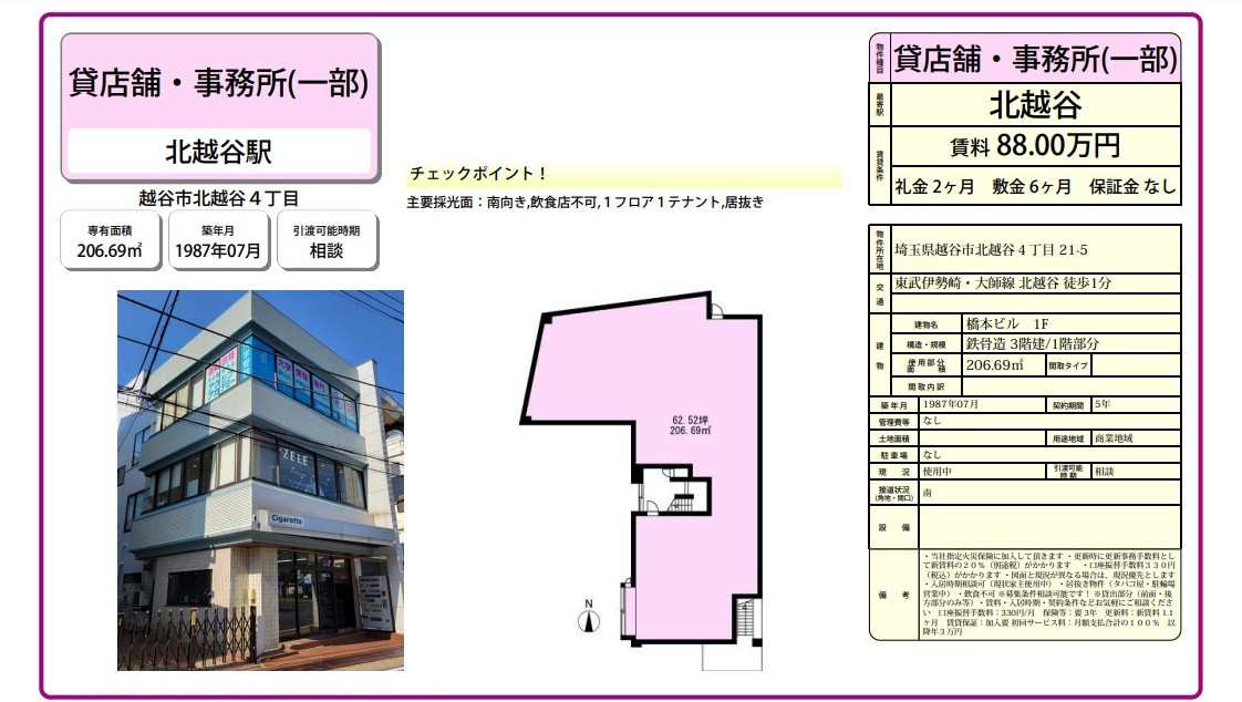 埼玉県越谷市北越谷4-21-5の賃貸事務所(貸事務所)・貸店舗をお探しのお客様へご案内-このたびは首都圏最大級、貸事務所・貸店舗専門ポータルサイトの埼玉オフィスMOVEをご利用いただき誠に有り難うございます。事務所移転、飲食店開業や新規独立まで賃貸事務所・賃貸オフィス・貸店舗の仲介実績豊富なスタッフがフルサポート致します。埼玉県越谷市北越谷4-21-5の大型駐車場付貸事務所、重飲食、美容院や居抜き店舗、レンタルオフィスまで貸事務所(賃貸事務所)、貸店舗を簡単に検索できます!埼玉県越谷市北越谷4-21-5でSOHO、賃貸オフィス、一棟ビルの貸事務所の貸主・オーナー様には無料にて広告掲載いたしますので是非、お問い合わせください。その他、埼玉県越谷市北越谷4-21-5で貸事務所・貸店舗をお探しのテナント様にはフリーレント、引越しサービスやオフィスレイアウトもアドバイス出来ますのでご相談ください。