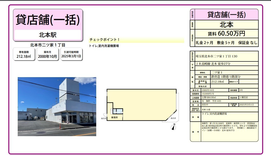 埼玉県北本市二ツ家1-130の賃貸事務所(貸事務所)・貸店舗をお探しのお客様へご案内-このたびは首都圏最大級、貸事務所・貸店舗専門ポータルサイトの埼玉オフィスMOVEをご利用いただき誠に有り難うございます。事務所移転、飲食店開業や新規独立まで賃貸事務所・賃貸オフィス・貸店舗の仲介実績豊富なスタッフがフルサポート致します。埼玉県北本市二ツ家1-130の大型駐車場付貸事務所、重飲食、美容院や居抜き店舗、レンタルオフィスまで貸事務所(賃貸事務所)、貸店舗を簡単に検索できます!埼玉県北本市二ツ家1-130でSOHO、賃貸オフィス、一棟ビルの貸事務所の貸主・オーナー様には無料にて広告掲載いたしますので是非、お問い合わせください。その他、埼玉県北本市二ツ家1-130で貸事務所・貸店舗をお探しのテナント様にはフリーレント、引越しサービスやオフィスレイアウトもアドバイス出来ますのでご相談ください。 |
