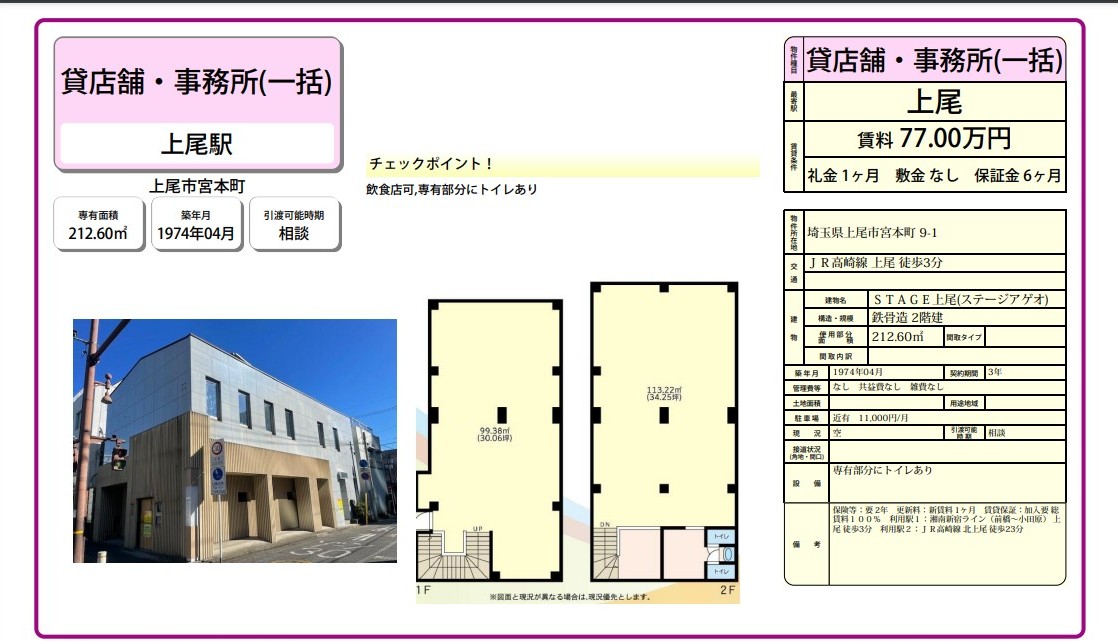 埼玉県上尾市宮本町9-1の賃貸事務所(貸事務所)・貸店舗をお探しのお客様へご案内-このたびは首都圏最大級、貸事務所・貸店舗専門ポータルサイトの埼玉オフィスMOVEをご利用いただき誠に有り難うございます。事務所移転、飲食店開業や新規独立まで賃貸事務所・賃貸オフィス・貸店舗の仲介実績豊富なスタッフがフルサポート致します。埼玉県上尾市宮本町9-1の大型駐車場付貸事務所、重飲食、美容院や居抜き店舗、レンタルオフィスまで貸事務所(賃貸事務所)、貸店舗を簡単に検索できます!埼玉県上尾市宮本町9-1でSOHO、賃貸オフィス、一棟ビルの貸事務所の貸主・オーナー様には無料にて広告掲載いたしますので是非、お問い合わせください。その他、埼玉県上尾市宮本町9-1で貸事務所・貸店舗をお探しのテナント様にはフリーレント、引越しサービスやオフィスレイアウトもアドバイス出来ますのでご相談ください。
