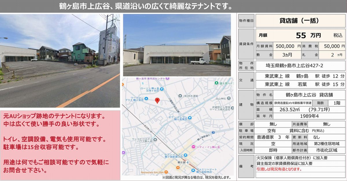 埼玉県鶴ヶ島市上広谷427-2 (鶴ヶ島) 鶴ヶ島 店舗倉庫 P15台 詳細データ