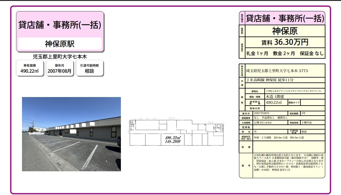 埼玉県児玉郡上里町大字七本木5775 (神保原) 上里町七本木テナント 詳細データ