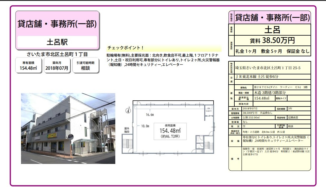 埼玉県 さいたま市北区土呂町1-25-5の賃貸事務所(貸事務所)・貸店舗をお探しのお客様へご案内-このたびは首都圏最大級、貸事務所・貸店舗専門ポータルサイトの埼玉オフィスMOVEをご利用いただき誠に有り難うございます。事務所移転、飲食店開業や新規独立まで賃貸事務所・賃貸オフィス・貸店舗の仲介実績豊富なスタッフがフルサポート致します。埼玉県さいたま市北区土呂町1-25-5の大型駐車場付貸事務所、重飲食、美容院や居抜き店舗、レンタルオフィスまで貸事務所(賃貸事務所)、貸店舗を簡単に検索できます!埼玉県さいたま市北区土呂町1-25-5でSOHO、賃貸オフィス、一棟ビルの貸事務所の貸主・オーナー様には無料にて広告掲載いたしますので是非、お問い合わせください。その他、埼玉県さいたま市北区土呂町1-25-5で貸事務所・貸店舗をお探しのテナント様にはフリーレント、引越しサービスやオフィスレイアウトもアドバイス出来ますのでご相談ください。