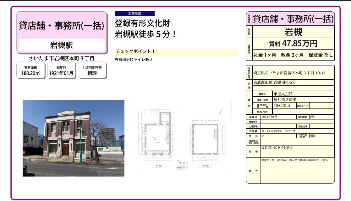 埼玉県さいたま市岩槻区本町3-13-11の賃貸事務所(貸事務所)・貸店舗をお探しのお客様へご案内-このたびは首都圏最大級、貸事務所・貸店舗専門ポータルサイトの埼玉オフィスMOVEをご利用いただき誠に有り難うございます。事務所移転、飲食店開業や新規独立まで賃貸事務所・賃貸オフィス・貸店舗の仲介実績豊富なスタッフがフルサポート致します。埼玉県さいたま市岩槻区本町3-13-11の大型駐車場付貸事務所、重飲食、美容院や居抜き店舗、レンタルオフィスまで貸事務所(賃貸事務所)、貸店舗を簡単に検索できます!埼玉県さいたま市岩槻区本町3-13-11でSOHO、賃貸オフィス、一棟ビルの貸事務所の貸主・オーナー様には無料にて広告掲載いたしますので是非、お問い合わせください。その他、埼玉県さいたま市岩槻区本町3-13-11で貸事務所・貸店舗をお探しのテナント様にはフリーレント、引越しサービスやオフィスレイアウトもアドバイス出来ますのでご相談ください。 |