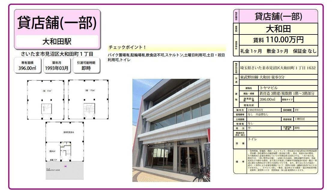 埼玉県さいたま市見沼区大和田町1-1632 (大和田) トヤマビル 詳細データ