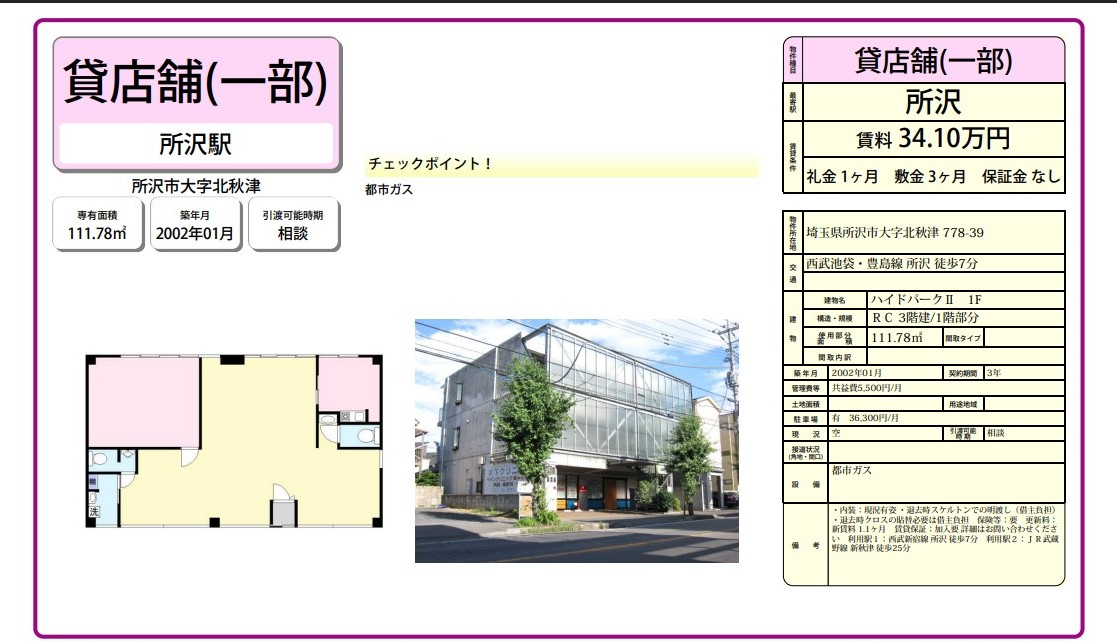 埼玉県 所沢市大字北秋津778-39の賃貸事務所(貸事務所)・貸店舗をお探しのお客様へご案内-このたびは首都圏最大級、貸事務所・貸店舗専門ポータルサイトの埼玉オフィスMOVEをご利用いただき誠に有り難うございます。事務所移転、飲食店開業や新規独立まで賃貸事務所・賃貸オフィス・貸店舗の仲介実績豊富なスタッフがフルサポート致します。埼玉県所沢市大字北秋津778-39の大型駐車場付貸事務所、重飲食、美容院や居抜き店舗、レンタルオフィスまで貸事務所(賃貸事務所)、貸店舗を簡単に検索できます!埼玉県所沢市大字北秋津778-39でSOHO、賃貸オフィス、一棟ビルの貸事務所の貸主・オーナー様には無料にて広告掲載いたしますので是非、お問い合わせください。その他、埼玉県所沢市大字北秋津778-39で貸事務所・貸店舗をお探しのテナント様にはフリーレント、引越しサービスやオフィスレイアウトもアドバイス出来ますのでご相談ください。