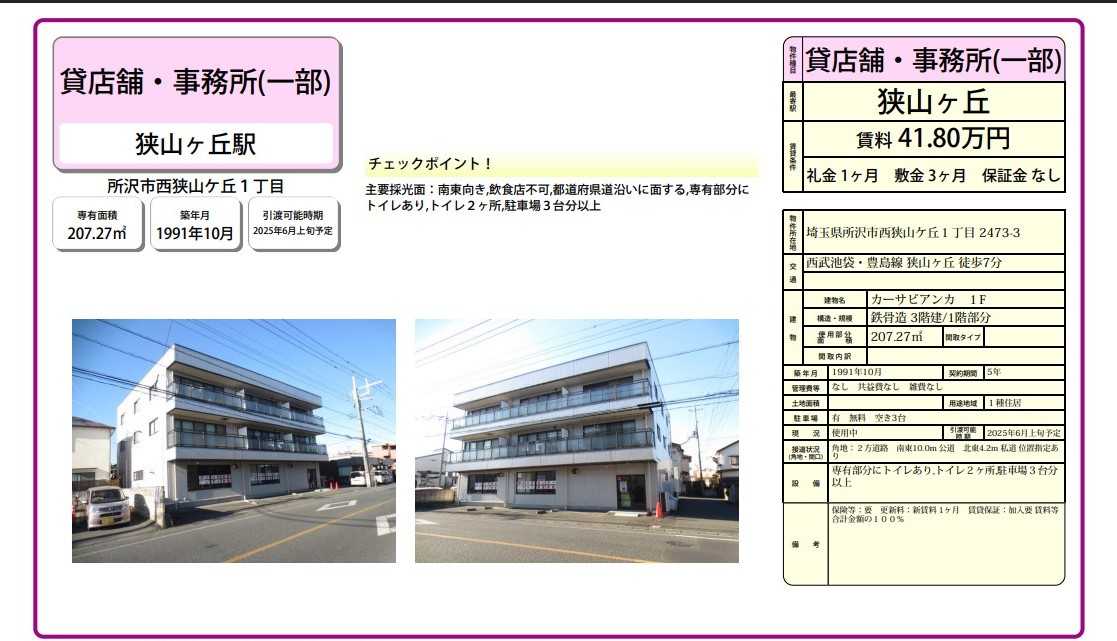 埼玉県 所沢市西狭山ケ丘1-2473-3の賃貸事務所(貸事務所)・貸店舗をお探しのお客様へご案内-このたびは首都圏最大級、貸事務所・貸店舗専門ポータルサイトの埼玉オフィスMOVEをご利用いただき誠に有り難うございます。事務所移転、飲食店開業や新規独立まで賃貸事務所・賃貸オフィス・貸店舗の仲介実績豊富なスタッフがフルサポート致します。埼玉県所沢市西狭山ケ丘1-2473-3の大型駐車場付貸事務所、重飲食、美容院や居抜き店舗、レンタルオフィスまで貸事務所(賃貸事務所)、貸店舗を簡単に検索できます!埼玉県所沢市西狭山ケ丘1-2473-3でSOHO、賃貸オフィス、一棟ビルの貸事務所の貸主・オーナー様には無料にて広告掲載いたしますので是非、お問い合わせください。その他、埼玉県所沢市西狭山ケ丘1-2473-3で貸事務所・貸店舗をお探しのテナント様にはフリーレント、引越しサービスやオフィスレイアウトもアドバイス出来ますのでご相談ください。