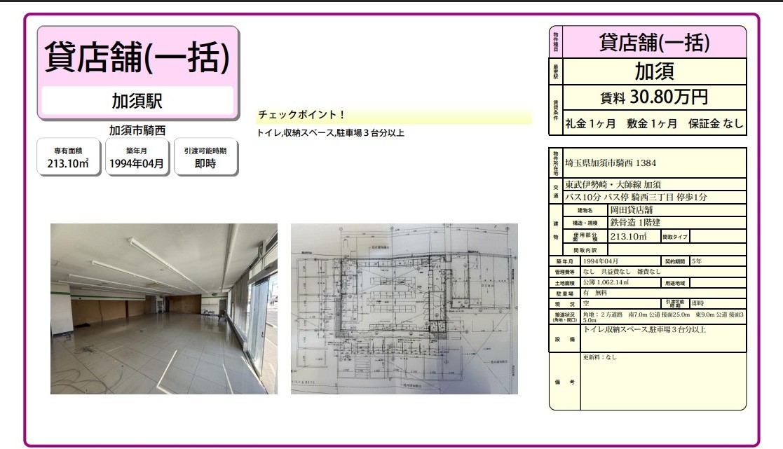 埼玉県加須市騎西1384 (加須) 岡田貸店舗 詳細データ