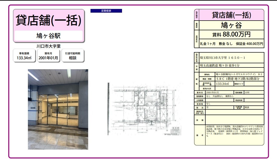 埼玉県川口市大字里1650-1の賃貸事務所(貸事務所)・貸店舗をお探しのお客様へご案内-このたびは首都圏最大級、貸事務所・貸店舗専門ポータルサイトの埼玉オフィスMOVEをご利用いただき誠に有り難うございます。事務所移転、飲食店開業や新規独立まで賃貸事務所・賃貸オフィス・貸店舗の仲介実績豊富なスタッフがフルサポート致します。埼玉県川口市大字里1650-1の大型駐車場付貸事務所、重飲食、美容院や居抜き店舗、レンタルオフィスまで貸事務所(賃貸事務所)、貸店舗を簡単に検索できます!埼玉県川口市大字里1650-1でSOHO、賃貸オフィス、一棟ビルの貸事務所の貸主・オーナー様には無料にて広告掲載いたしますので是非、お問い合わせください。その他、埼玉県川口市大字里1650-1で貸事務所・貸店舗をお探しのテナント様にはフリーレント、引越しサービスやオフィスレイアウトもアドバイス出来ますのでご相談ください。 |