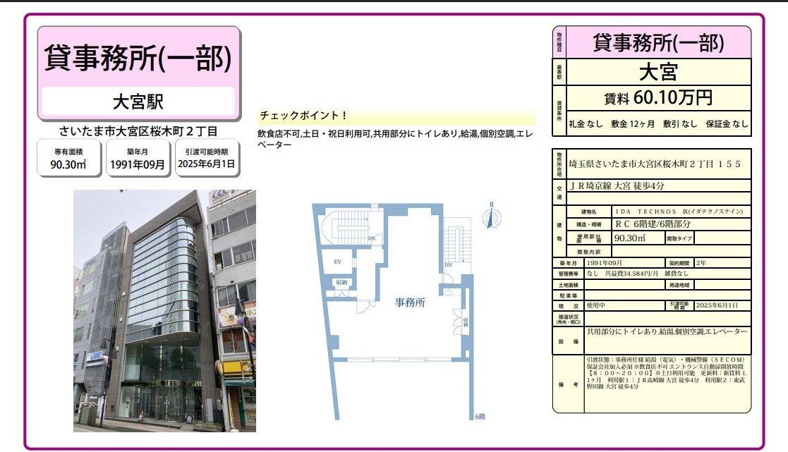 埼玉県さいたま市大宮区桜木町2-155の賃貸事務所(貸事務所)・貸店舗をお探しのお客様へご案内-このたびは首都圏最大級、貸事務所・貸店舗専門ポータルサイトの埼玉オフィスMOVEをご利用いただき誠に有り難うございます。事務所移転、飲食店開業や新規独立まで賃貸事務所・賃貸オフィス・貸店舗の仲介実績豊富なスタッフがフルサポート致します。埼玉県さいたま市大宮区桜木町2-155の大型駐車場付貸事務所、重飲食、美容院や居抜き店舗、レンタルオフィスまで貸事務所(賃貸事務所)、貸店舗を簡単に検索できます!埼玉県さいたま市大宮区桜木町2-155でSOHO、賃貸オフィス、一棟ビルの貸事務所の貸主・オーナー様には無料にて広告掲載いたしますので是非、お問い合わせください。その他、埼玉県さいたま市大宮区桜木町2-155で貸事務所・貸店舗をお探しのテナント様にはフリーレント、引越しサービスやオフィスレイアウトもアドバイス出来ますのでご相談ください。 |