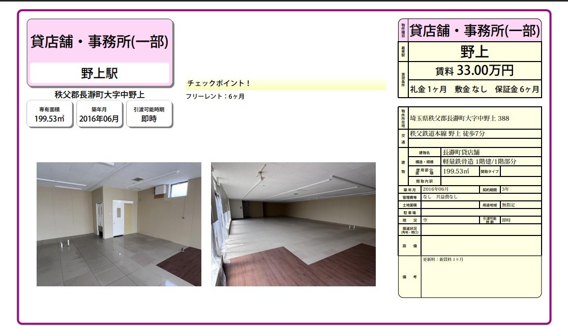 埼玉県秩父郡長瀞町大字中野上388の賃貸事務所(貸事務所)・貸店舗をお探しのお客様へご案内-このたびは首都圏最大級、貸事務所・貸店舗専門ポータルサイトの埼玉オフィスMOVEをご利用いただき誠に有り難うございます。事務所移転、飲食店開業や新規独立まで賃貸事務所・賃貸オフィス・貸店舗の仲介実績豊富なスタッフがフルサポート致します。埼玉県秩父郡長瀞町大字中野上388の大型駐車場付貸事務所、重飲食、美容院や居抜き店舗、レンタルオフィスまで貸事務所(賃貸事務所)、貸店舗を簡単に検索できます!埼玉県秩父郡長瀞町大字中野上388でSOHO、賃貸オフィス、一棟ビルの貸事務所の貸主・オーナー様には無料にて広告掲載いたしますので是非、お問い合わせください。その他、埼玉県秩父郡長瀞町大字中野上388で貸事務所・貸店舗をお探しのテナント様にはフリーレント、引越しサービスやオフィスレイアウトもアドバイス出来ますのでご相談ください。