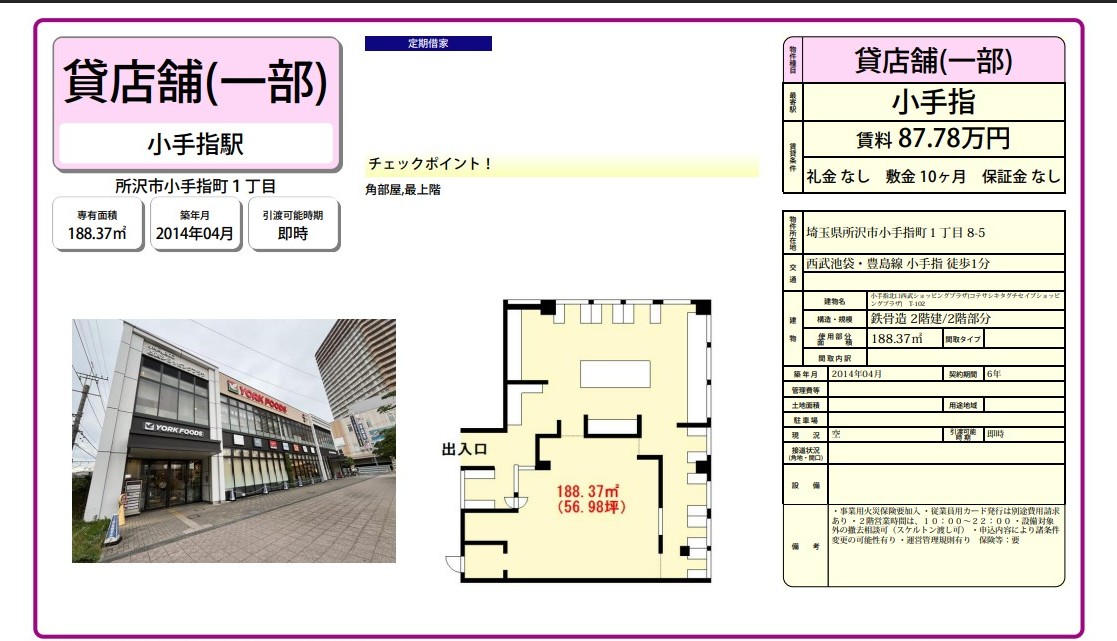 | 物件名 | 小手指北口西武ショッピングプラザ(コテサシキタグチセイブショッピングプラザ) |