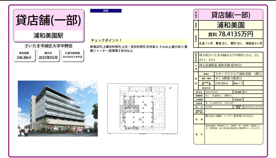 埼玉県さいたま市緑区大字中野田25-2、22、23-1、23-2 (浦和美園) スターズスクエア浦和美園 詳細データ
