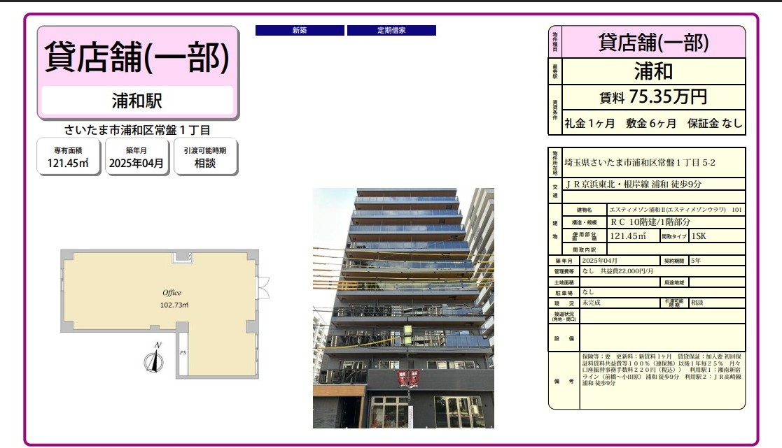 埼玉県さいたま市浦和区常盤1-5-2の賃貸事務所(貸事務所)・貸店舗をお探しのお客様へご案内-このたびは首都圏最大級、貸事務所・貸店舗専門ポータルサイトの埼玉オフィスMOVEをご利用いただき誠に有り難うございます。事務所移転、飲食店開業や新規独立まで賃貸事務所・賃貸オフィス・貸店舗の仲介実績豊富なスタッフがフルサポート致します。埼玉県さいたま市浦和区常盤1-5-2の大型駐車場付貸事務所、重飲食、美容院や居抜き店舗、レンタルオフィスまで貸事務所(賃貸事務所)、貸店舗を簡単に検索できます!埼玉県さいたま市浦和区常盤1-5-2でSOHO、賃貸オフィス、一棟ビルの貸事務所の貸主・オーナー様には無料にて広告掲載いたしますので是非、お問い合わせください。その他、埼玉県さいたま市浦和区常盤1-5-2で貸事務所・貸店舗をお探しのテナント様にはフリーレント、引越しサービスやオフィスレイアウトもアドバイス出来ますのでご相談ください。 |