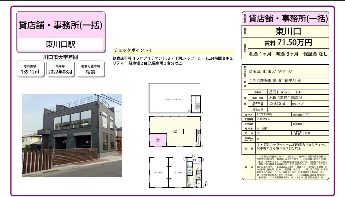 埼玉県川口市大字差間97の賃貸事務所(貸事務所)・貸店舗をお探しのお客様へご案内-このたびは首都圏最大級、貸事務所・貸店舗専門ポータルサイトの埼玉オフィスMOVEをご利用いただき誠に有り難うございます。事務所移転、飲食店開業や新規独立まで賃貸事務所・賃貸オフィス・貸店舗の仲介実績豊富なスタッフがフルサポート致します。埼玉県川口市大字差間97の大型駐車場付貸事務所、重飲食、美容院や居抜き店舗、レンタルオフィスまで貸事務所(賃貸事務所)、貸店舗を簡単に検索できます!埼玉県川口市大字差間97でSOHO、賃貸オフィス、一棟ビルの貸事務所の貸主・オーナー様には無料にて広告掲載いたしますので是非、お問い合わせください。その他、埼玉県川口市大字差間97で貸事務所・貸店舗をお探しのテナント様にはフリーレント、引越しサービスやオフィスレイアウトもアドバイス出来ますのでご相談ください。 |