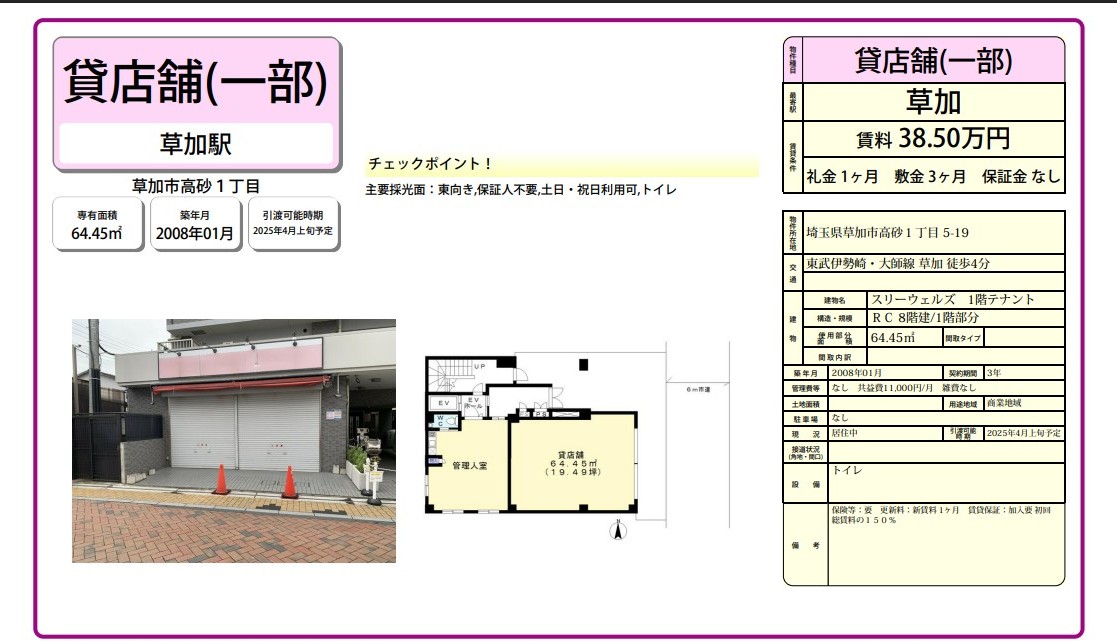 埼玉県草加市高砂1-5-19の賃貸事務所(貸事務所)・貸店舗をお探しのお客様へご案内-このたびは首都圏最大級、貸事務所・貸店舗専門ポータルサイトの埼玉オフィスMOVEをご利用いただき誠に有り難うございます。事務所移転、飲食店開業や新規独立まで賃貸事務所・賃貸オフィス・貸店舗の仲介実績豊富なスタッフがフルサポート致します。埼玉県草加市高砂1-5-19の大型駐車場付貸事務所、重飲食、美容院や居抜き店舗、レンタルオフィスまで貸事務所(賃貸事務所)、貸店舗を簡単に検索できます!埼玉県草加市高砂1-5-19でSOHO、賃貸オフィス、一棟ビルの貸事務所の貸主・オーナー様には無料にて広告掲載いたしますので是非、お問い合わせください。その他、埼玉県草加市高砂1-5-19で貸事務所・貸店舗をお探しのテナント様にはフリーレント、引越しサービスやオフィスレイアウトもアドバイス出来ますのでご相談ください。
