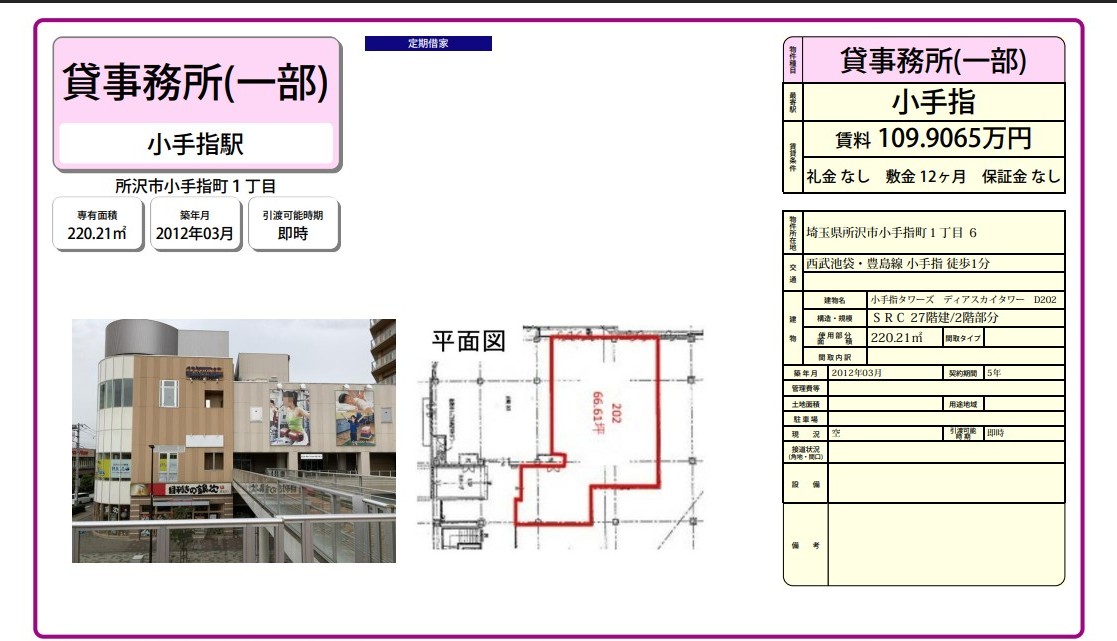 埼玉県所沢市小手指町1-6の賃貸事務所(貸事務所)・貸店舗をお探しのお客様へご案内-このたびは首都圏最大級、貸事務所・貸店舗専門ポータルサイトの埼玉オフィスMOVEをご利用いただき誠に有り難うございます。事務所移転、飲食店開業や新規独立まで賃貸事務所・賃貸オフィス・貸店舗の仲介実績豊富なスタッフがフルサポート致します。埼玉県所沢市小手指町1-6の大型駐車場付貸事務所、重飲食、美容院や居抜き店舗、レンタルオフィスまで貸事務所(賃貸事務所)、貸店舗を簡単に検索できます!埼玉県所沢市小手指町1-6でSOHO、賃貸オフィス、一棟ビルの貸事務所の貸主・オーナー様には無料にて広告掲載いたしますので是非、お問い合わせください。その他、埼玉県所沢市小手指町1-6で貸事務所・貸店舗をお探しのテナント様にはフリーレント、引越しサービスやオフィスレイアウトもアドバイス出来ますのでご相談ください。 |