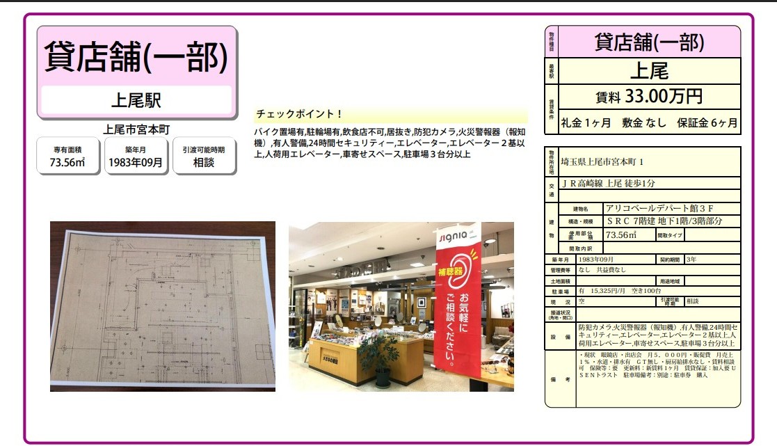 埼玉県上尾市宮本町1の賃貸事務所(貸事務所)・貸店舗をお探しのお客様へご案内-このたびは首都圏最大級、貸事務所・貸店舗専門ポータルサイトの埼玉オフィスMOVEをご利用いただき誠に有り難うございます。事務所移転、飲食店開業や新規独立まで賃貸事務所・賃貸オフィス・貸店舗の仲介実績豊富なスタッフがフルサポート致します。埼玉県上尾市宮本町1の大型駐車場付貸事務所、重飲食、美容院や居抜き店舗、レンタルオフィスまで貸事務所(賃貸事務所)、貸店舗を簡単に検索できます!埼玉県上尾市宮本町1でSOHO、賃貸オフィス、一棟ビルの貸事務所の貸主・オーナー様には無料にて広告掲載いたしますので是非、お問い合わせください。その他、埼玉県上尾市宮本町1で貸事務所・貸店舗をお探しのテナント様にはフリーレント、引越しサービスやオフィスレイアウトもアドバイス出来ますのでご相談ください。 |