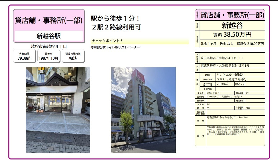 埼玉県越谷市南越谷4-11の賃貸事務所(貸事務所)・貸店舗をお探しのお客様へご案内-このたびは首都圏最大級、貸事務所・貸店舗専門ポータルサイトの埼玉オフィスMOVEをご利用いただき誠に有り難うございます。事務所移転、飲食店開業や新規独立まで賃貸事務所・賃貸オフィス・貸店舗の仲介実績豊富なスタッフがフルサポート致します。埼玉県越谷市南越谷4-11の大型駐車場付貸事務所、重飲食、美容院や居抜き店舗、レンタルオフィスまで貸事務所(賃貸事務所)、貸店舗を簡単に検索できます!埼玉県越谷市南越谷4-11でSOHO、賃貸オフィス、一棟ビルの貸事務所の貸主・オーナー様には無料にて広告掲載いたしますので是非、お問い合わせください。その他、埼玉県越谷市南越谷4-11で貸事務所・貸店舗をお探しのテナント様にはフリーレント、引越しサービスやオフィスレイアウトもアドバイス出来ますのでご相談ください。 |