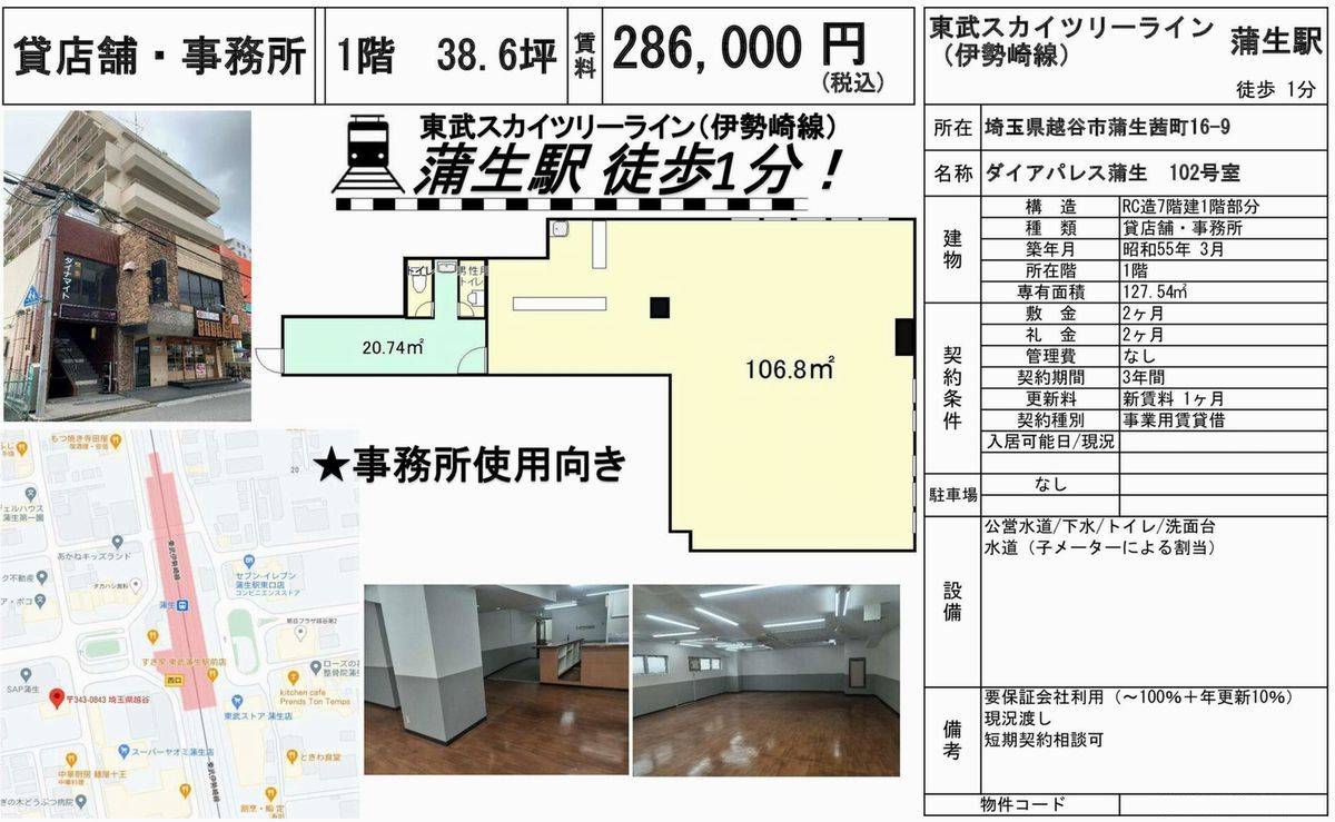 埼玉県 越谷市蒲生茜町16-9の賃貸事務所(貸事務所)・貸店舗をお探しのお客様へご案内-このたびは首都圏最大級、貸事務所・貸店舗専門ポータルサイトの埼玉オフィスMOVEをご利用いただき誠に有り難うございます。事務所移転、飲食店開業や新規独立まで賃貸事務所・賃貸オフィス・貸店舗の仲介実績豊富なスタッフがフルサポート致します。埼玉県越谷市蒲生茜町16-9の大型駐車場付貸事務所、重飲食、美容院や居抜き店舗、レンタルオフィスまで貸事務所(賃貸事務所)、貸店舗を簡単に検索できます!埼玉県越谷市蒲生茜町16-9でSOHO、賃貸オフィス、一棟ビルの貸事務所の貸主・オーナー様には無料にて広告掲載いたしますので是非、お問い合わせください。その他、埼玉県越谷市蒲生茜町16-9で貸事務所・貸店舗をお探しのテナント様にはフリーレント、引越しサービスやオフィスレイアウトもアドバイス出来ますのでご相談ください。