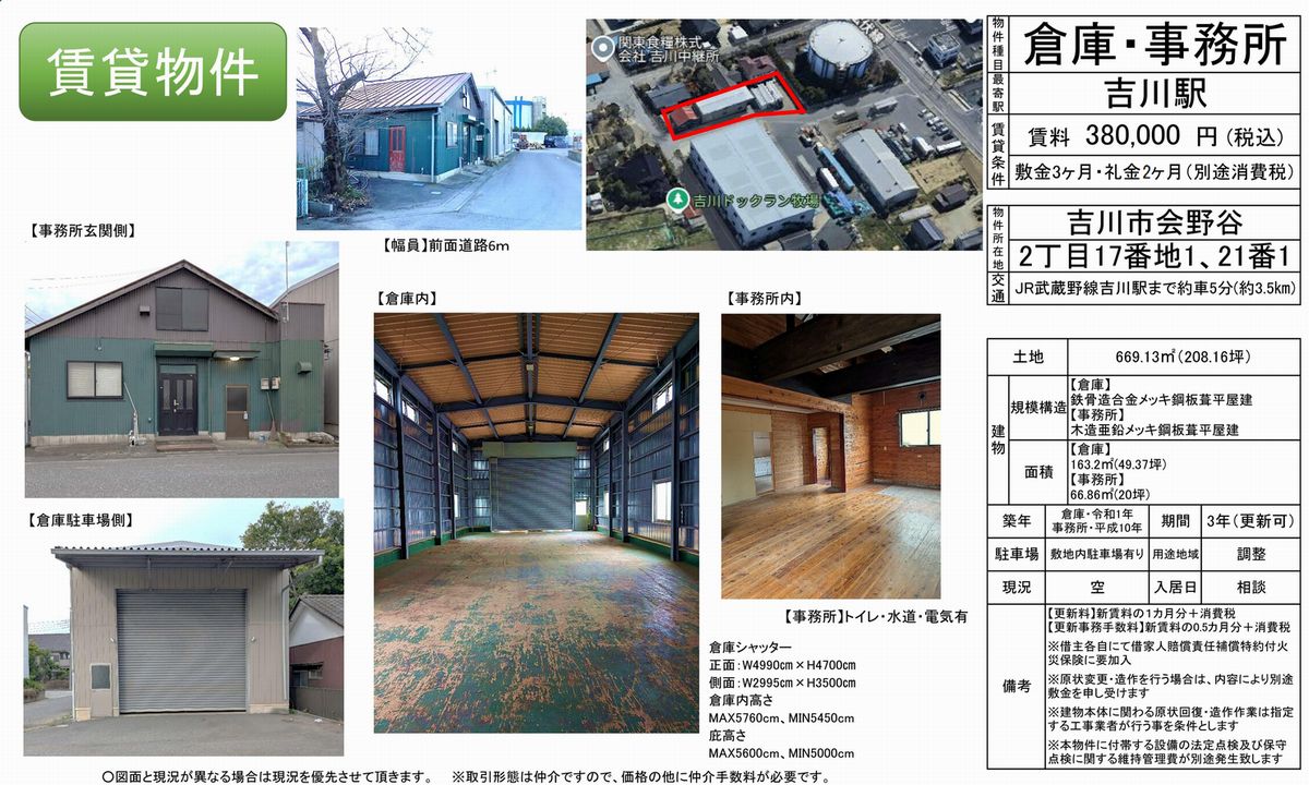 | 物件名 | 吉川 事務所倉庫 敷地208坪 |