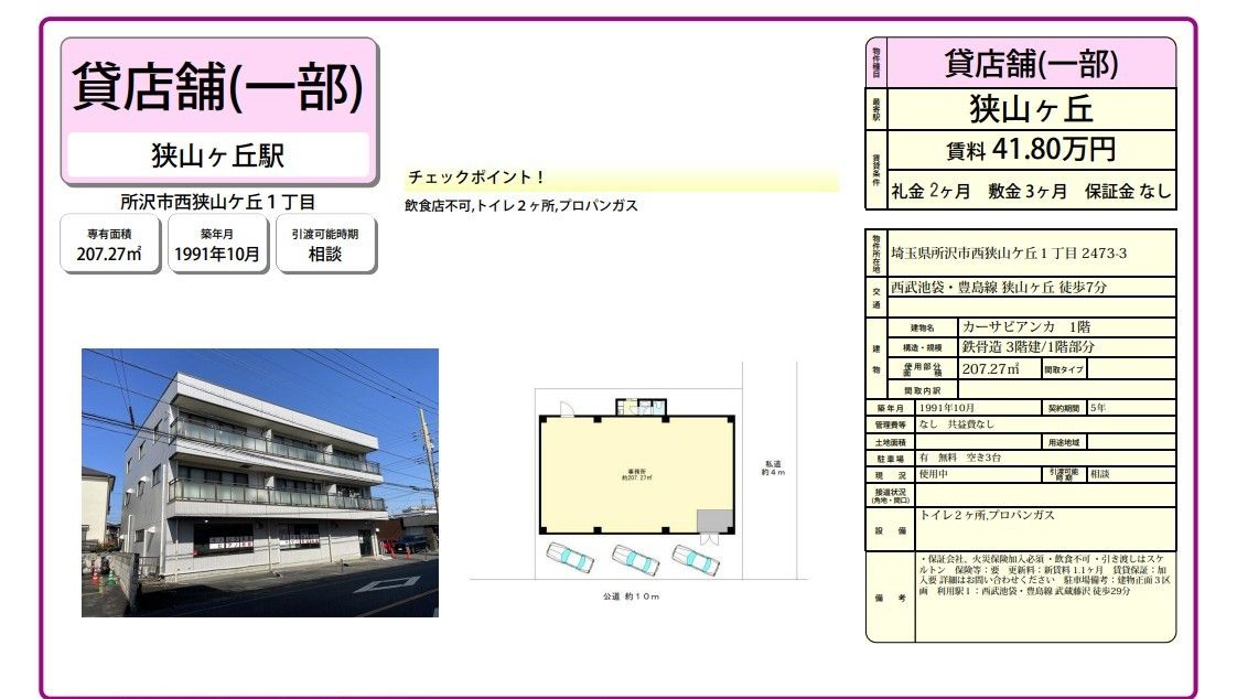 埼玉県所沢市西狭山ケ丘1-2473-3の賃貸事務所(貸事務所)・貸店舗をお探しのお客様へご案内-このたびは首都圏最大級、貸事務所・貸店舗専門ポータルサイトの埼玉オフィスMOVEをご利用いただき誠に有り難うございます。事務所移転、飲食店開業や新規独立まで賃貸事務所・賃貸オフィス・貸店舗の仲介実績豊富なスタッフがフルサポート致します。埼玉県所沢市西狭山ケ丘1-2473-3の大型駐車場付貸事務所、重飲食、美容院や居抜き店舗、レンタルオフィスまで貸事務所(賃貸事務所)、貸店舗を簡単に検索できます!埼玉県所沢市西狭山ケ丘1-2473-3でSOHO、賃貸オフィス、一棟ビルの貸事務所の貸主・オーナー様には無料にて広告掲載いたしますので是非、お問い合わせください。その他、埼玉県所沢市西狭山ケ丘1-2473-3で貸事務所・貸店舗をお探しのテナント様にはフリーレント、引越しサービスやオフィスレイアウトもアドバイス出来ますのでご相談ください。 |