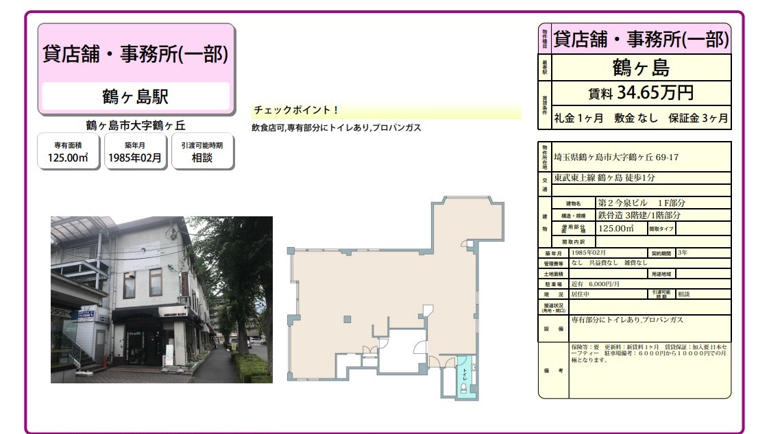 埼玉県鶴ヶ島市大字鶴ヶ丘69-17の賃貸事務所(貸事務所)・貸店舗をお探しのお客様へご案内-このたびは首都圏最大級、貸事務所・貸店舗専門ポータルサイトの埼玉オフィスMOVEをご利用いただき誠に有り難うございます。事務所移転、飲食店開業や新規独立まで賃貸事務所・賃貸オフィス・貸店舗の仲介実績豊富なスタッフがフルサポート致します。埼玉県鶴ヶ島市大字鶴ヶ丘69-17の大型駐車場付貸事務所、重飲食、美容院や居抜き店舗、レンタルオフィスまで貸事務所(賃貸事務所)、貸店舗を簡単に検索できます!埼玉県鶴ヶ島市大字鶴ヶ丘69-17でSOHO、賃貸オフィス、一棟ビルの貸事務所の貸主・オーナー様には無料にて広告掲載いたしますので是非、お問い合わせください。その他、埼玉県鶴ヶ島市大字鶴ヶ丘69-17で貸事務所・貸店舗をお探しのテナント様にはフリーレント、引越しサービスやオフィスレイアウトもアドバイス出来ますのでご相談ください。 |