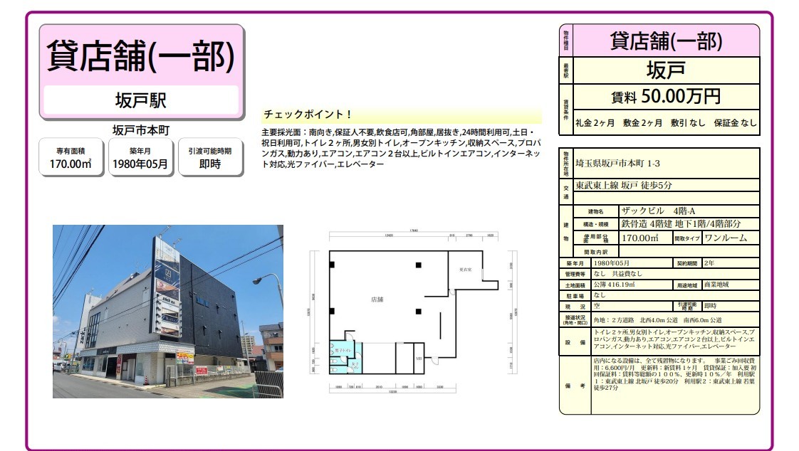 埼玉県坂戸市本町1-3の賃貸事務所(貸事務所)・貸店舗をお探しのお客様へご案内-このたびは首都圏最大級、貸事務所・貸店舗専門ポータルサイトの埼玉オフィスMOVEをご利用いただき誠に有り難うございます。事務所移転、飲食店開業や新規独立まで賃貸事務所・賃貸オフィス・貸店舗の仲介実績豊富なスタッフがフルサポート致します。埼玉県坂戸市本町1-3の大型駐車場付貸事務所、重飲食、美容院や居抜き店舗、レンタルオフィスまで貸事務所(賃貸事務所)、貸店舗を簡単に検索できます!埼玉県坂戸市本町1-3でSOHO、賃貸オフィス、一棟ビルの貸事務所の貸主・オーナー様には無料にて広告掲載いたしますので是非、お問い合わせください。その他、埼玉県坂戸市本町1-3で貸事務所・貸店舗をお探しのテナント様にはフリーレント、引越しサービスやオフィスレイアウトもアドバイス出来ますのでご相談ください。 |