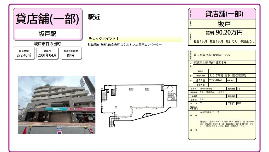| 備考 | 飲食店可スケルトン 条件交渉ご相談ください。 |