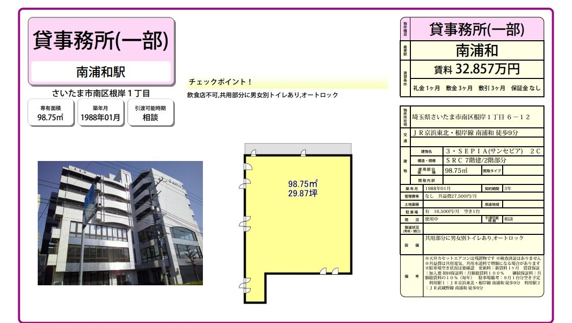 埼玉県さいたま市南区根岸1-6-12の賃貸事務所(貸事務所)・貸店舗をお探しのお客様へご案内-このたびは首都圏最大級、貸事務所・貸店舗専門ポータルサイトの埼玉オフィスMOVEをご利用いただき誠に有り難うございます。事務所移転、飲食店開業や新規独立まで賃貸事務所・賃貸オフィス・貸店舗の仲介実績豊富なスタッフがフルサポート致します。埼玉県さいたま市南区根岸1-6-12の大型駐車場付貸事務所、重飲食、美容院や居抜き店舗、レンタルオフィスまで貸事務所(賃貸事務所)、貸店舗を簡単に検索できます!埼玉県さいたま市南区根岸1-6-12でSOHO、賃貸オフィス、一棟ビルの貸事務所の貸主・オーナー様には無料にて広告掲載いたしますので是非、お問い合わせください。その他、埼玉県さいたま市南区根岸1-6-12で貸事務所・貸店舗をお探しのテナント様にはフリーレント、引越しサービスやオフィスレイアウトもアドバイス出来ますのでご相談ください。 |