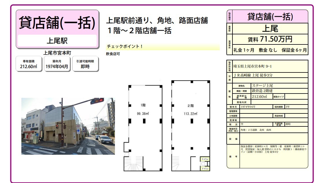 | 備考 | 飲食店可 条件交渉ご相談ください。 |
