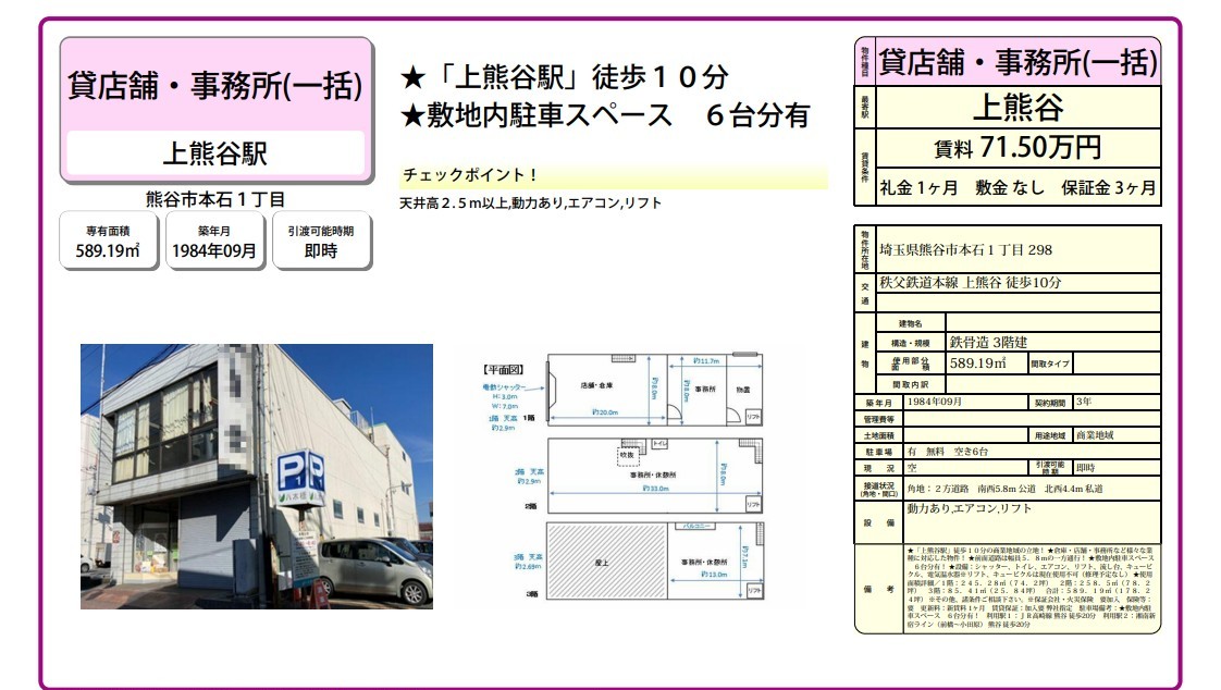 動力ありエアコンリフト ★「上熊谷駅」徒歩10分の商業地域の立地!★倉庫・店舗・事務所など様々な業種に対応した物件!★前面道路は幅員5.8mの一方通行!★敷地内駐車スペース6台分有!★設備:シャッター、トイレ、エアコン、リフト、流し台、キュービクル、電気温水器※リフト、キュービクルは現在使用不可(修理予定なし)★使用面積詳細/1階:245.28u(74.2坪)2階:258.5u(78.2坪)3階:85.41u(25.84坪)合計:589.19u(178.24坪)※その他、諸条件ご相談下さい。※保証会社・火災保険要加入
