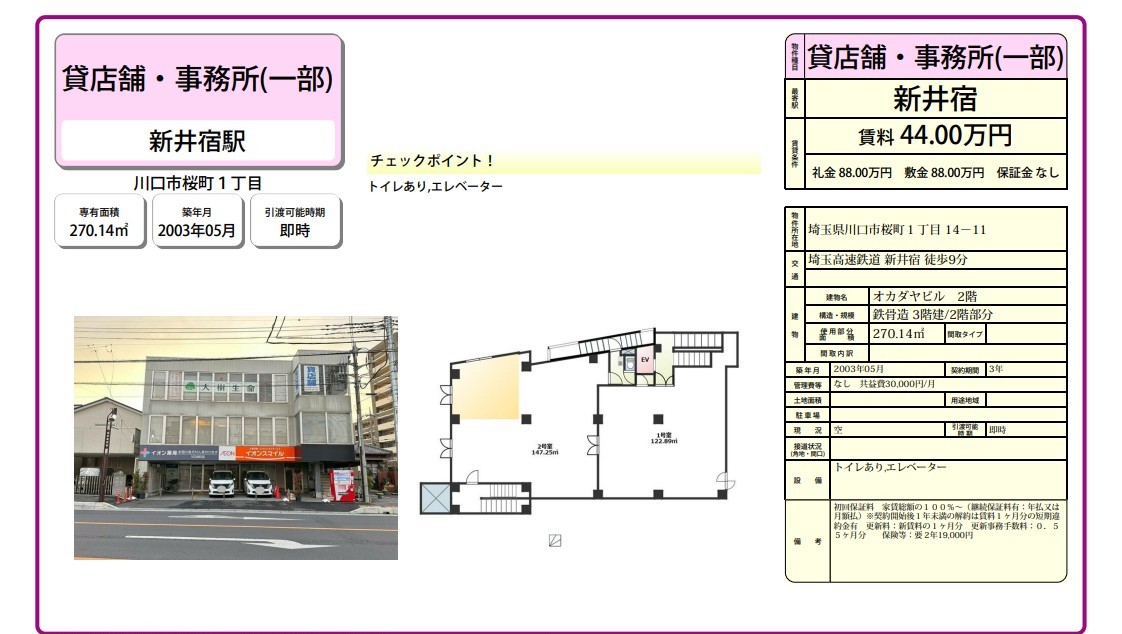 埼玉県川口市桜町1-14-11の賃貸事務所(貸事務所)・貸店舗をお探しのお客様へご案内-このたびは首都圏最大級、貸事務所・貸店舗専門ポータルサイトの埼玉オフィスMOVEをご利用いただき誠に有り難うございます。事務所移転、飲食店開業や新規独立まで賃貸事務所・賃貸オフィス・貸店舗の仲介実績豊富なスタッフがフルサポート致します。埼玉県川口市桜町1-14-11の大型駐車場付貸事務所、重飲食、美容院や居抜き店舗、レンタルオフィスまで貸事務所(賃貸事務所)、貸店舗を簡単に検索できます!埼玉県川口市桜町1-14-11でSOHO、賃貸オフィス、一棟ビルの貸事務所の貸主・オーナー様には無料にて広告掲載いたしますので是非、お問い合わせください。その他、埼玉県川口市桜町1-14-11で貸事務所・貸店舗をお探しのテナント様にはフリーレント、引越しサービスやオフィスレイアウトもアドバイス出来ますのでご相談ください。 |