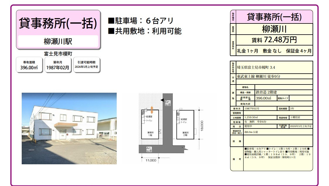 埼玉県富士見市榎町3.4 (柳瀬川) 柳瀬川 事務所 詳細データ