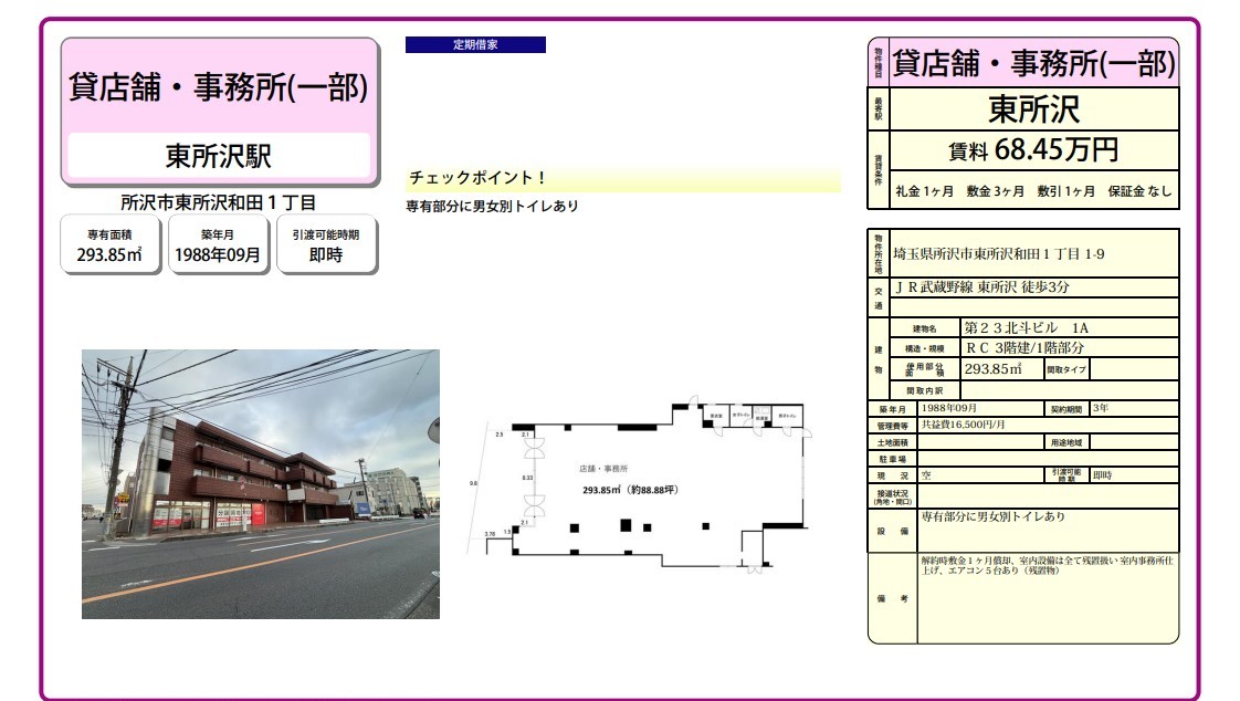 埼玉県所沢市東所沢和田1-1-9の賃貸事務所(貸事務所)・貸店舗をお探しのお客様へご案内-このたびは首都圏最大級、貸事務所・貸店舗専門ポータルサイトの埼玉オフィスMOVEをご利用いただき誠に有り難うございます。事務所移転、飲食店開業や新規独立まで賃貸事務所・賃貸オフィス・貸店舗の仲介実績豊富なスタッフがフルサポート致します。埼玉県所沢市東所沢和田1-1-9の大型駐車場付貸事務所、重飲食、美容院や居抜き店舗、レンタルオフィスまで貸事務所(賃貸事務所)、貸店舗を簡単に検索できます!埼玉県所沢市東所沢和田1-1-9でSOHO、賃貸オフィス、一棟ビルの貸事務所の貸主・オーナー様には無料にて広告掲載いたしますので是非、お問い合わせください。その他、埼玉県所沢市東所沢和田1-1-9で貸事務所・貸店舗をお探しのテナント様にはフリーレント、引越しサービスやオフィスレイアウトもアドバイス出来ますのでご相談ください。 |