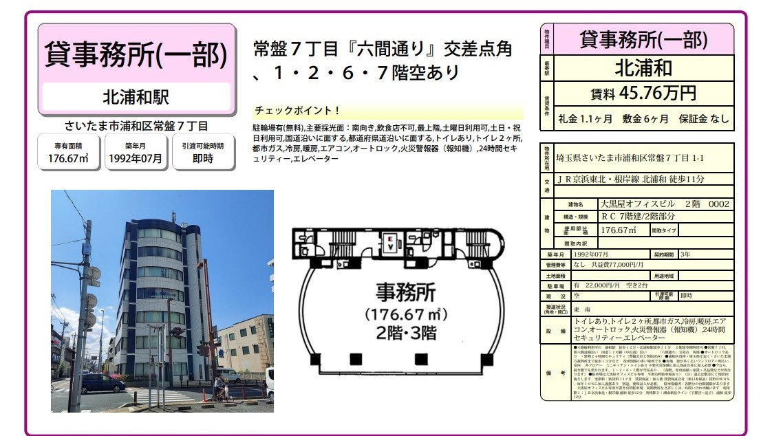 都市ガス冷房暖房エアコンオートロック火災警報器(報知機)24時間セキュリティーエレベーター ●4路線利用可の浦和駅徒歩12分・北浦和駅徒歩11分2駅徒歩圏利用可●常盤7丁目、新六間道路沿い国道17号線(中山道)沿い『六間通り』交差点角地●オートロックあり・建物24時間セキュリティ(警備会社と契約済み)●浦和区役所・埼玉県庁近く・さいたま地方裁判所まで徒歩13分など役所関係の多い場所です●角地窓が多く広いワンフロアー明るい室内各フロアーミニキッチン・トイレあり※要火災保険に加入保証会社に加入必要●今なら、続き階でも借りれます、1・2・6・7階が空室あり(各階、専用面積・家賃・共益費などが異なります)●駐車場は大黒屋オフィスビル専用平置有料駐車場あり)(注)退去は敷金にて現状回復とします