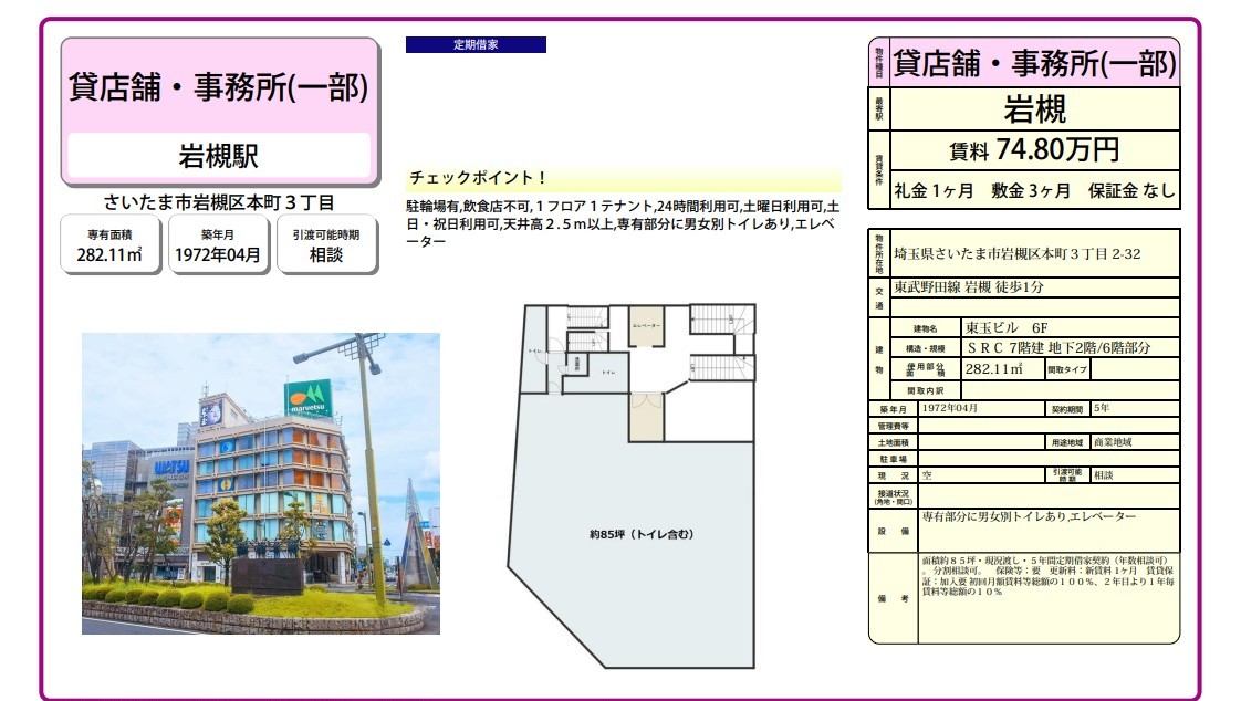 埼玉県 さいたま市岩槻区本町3-2-32の賃貸事務所(貸事務所)・貸店舗をお探しのお客様へご案内-このたびは首都圏最大級、貸事務所・貸店舗専門ポータルサイトの埼玉オフィスMOVEをご利用いただき誠に有り難うございます。事務所移転、飲食店開業や新規独立まで賃貸事務所・賃貸オフィス・貸店舗の仲介実績豊富なスタッフがフルサポート致します。埼玉県さいたま市岩槻区本町3-2-32の大型駐車場付貸事務所、重飲食、美容院や居抜き店舗、レンタルオフィスまで貸事務所(賃貸事務所)、貸店舗を簡単に検索できます!埼玉県さいたま市岩槻区本町3-2-32でSOHO、賃貸オフィス、一棟ビルの貸事務所の貸主・オーナー様には無料にて広告掲載いたしますので是非、お問い合わせください。その他、埼玉県さいたま市岩槻区本町3-2-32で貸事務所・貸店舗をお探しのテナント様にはフリーレント、引越しサービスやオフィスレイアウトもアドバイス出来ますのでご相談ください。