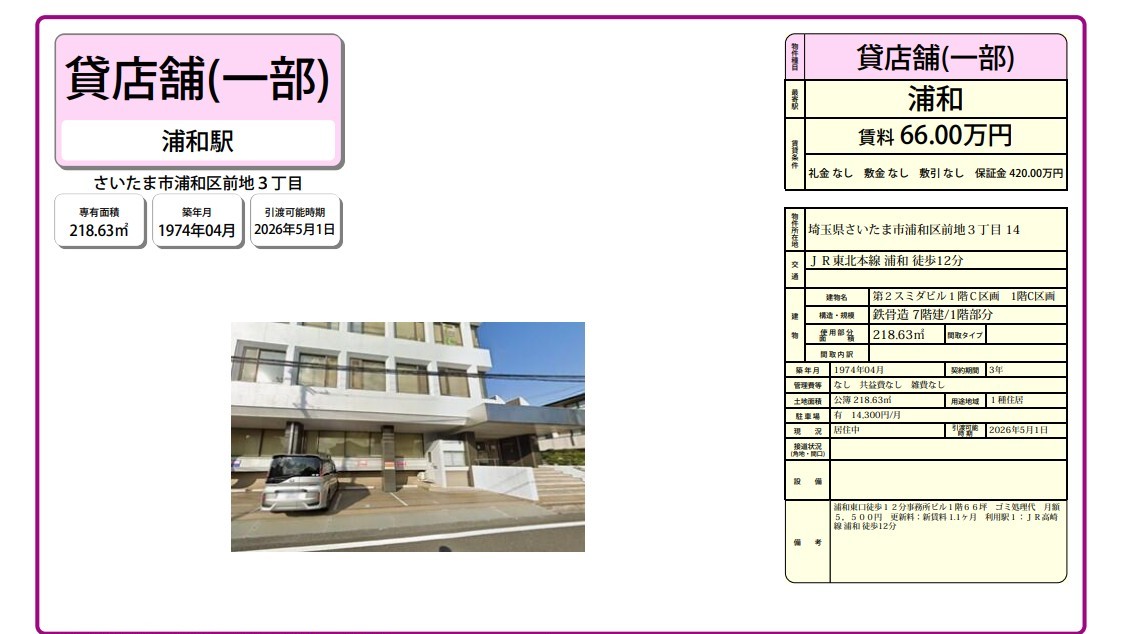 浦和東口徒歩12分事務所ビル1階66坪ゴミ処理代月額5,500円