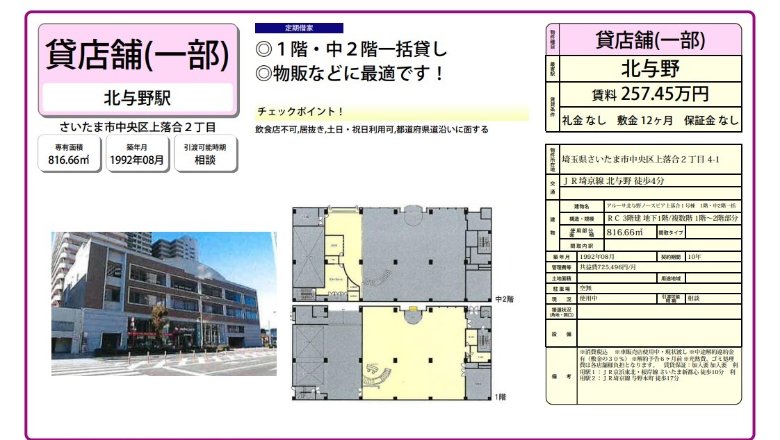 埼玉県 さいたま市中央区上落合2-4-1の賃貸事務所(貸事務所)・貸店舗をお探しのお客様へご案内-このたびは首都圏最大級、貸事務所・貸店舗専門ポータルサイトの埼玉オフィスMOVEをご利用いただき誠に有り難うございます。事務所移転、飲食店開業や新規独立まで賃貸事務所・賃貸オフィス・貸店舗の仲介実績豊富なスタッフがフルサポート致します。埼玉県さいたま市中央区上落合2-4-1の大型駐車場付貸事務所、重飲食、美容院や居抜き店舗、レンタルオフィスまで貸事務所(賃貸事務所)、貸店舗を簡単に検索できます!埼玉県さいたま市中央区上落合2-4-1でSOHO、賃貸オフィス、一棟ビルの貸事務所の貸主・オーナー様には無料にて広告掲載いたしますので是非、お問い合わせください。その他、埼玉県さいたま市中央区上落合2-4-1で貸事務所・貸店舗をお探しのテナント様にはフリーレント、引越しサービスやオフィスレイアウトもアドバイス出来ますのでご相談ください。